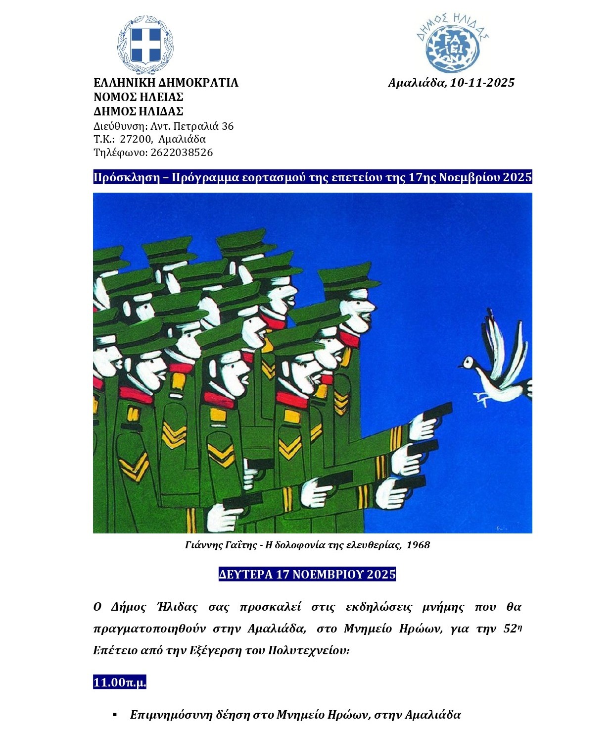 Ο Δήμος Ήλιδας τιμά την 52η Επέτειο από την Εξέγερση του Πολυτεχνείου, διοργανώνοντας εκδήλωση μνήμης τη Δευτέρα 17 Νοεμβρίου 2025, στην Αμαλιάδα, στο Μνημείο Ηρώων.