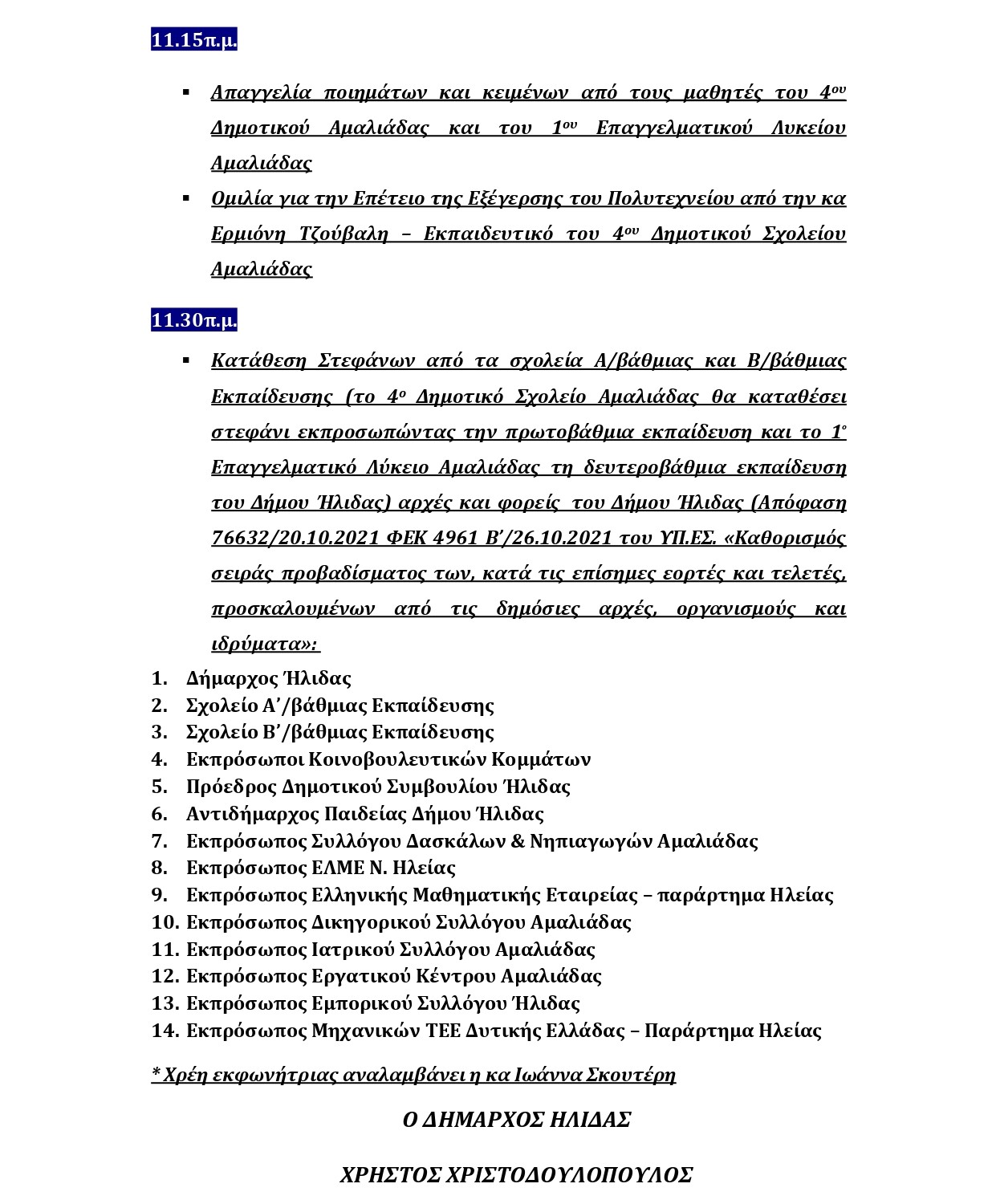 Ο Δήμος Ήλιδας καλεί τους δημότες, την εκπαιδευτική κοινότητα και όλους τους φορείς της περιοχής να παρευρεθούν και να αποδώσουν φόρο τιμής στους αγωνιστές του Πολυτεχνείου, τιμώντας το διαχρονικό σύνθημα «ΨΩΜΙ – ΠΑΙΔΕΙΑ – ΕΛΕΥΘΕΡΙΑ», που εξακολουθεί να μας εμπνέει.