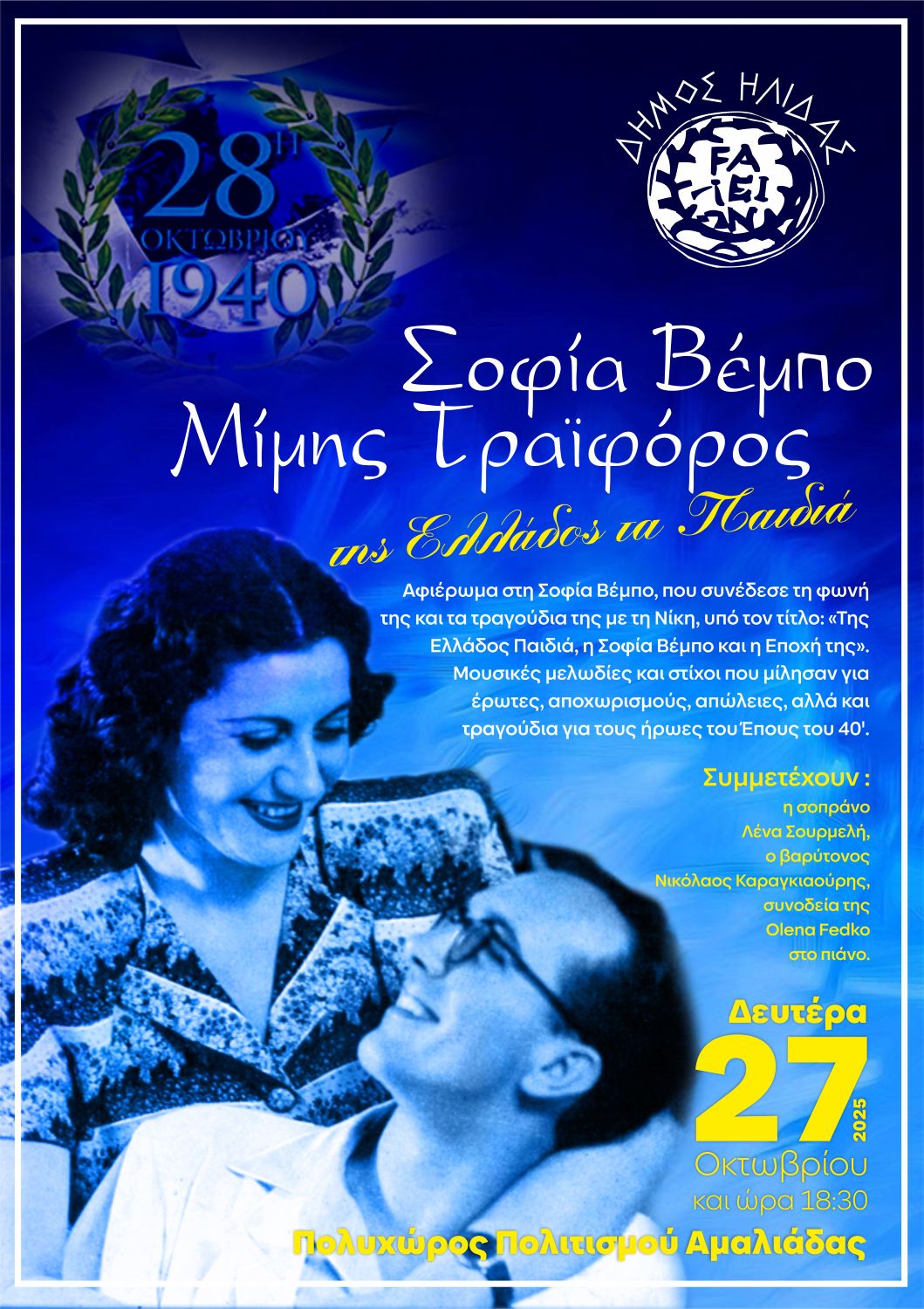 Μια βραδιά γεμάτη συγκίνηση, ιστορική μνήμη και μελωδίες που σφράγισαν το Έπος του 40’, είχε την ευκαιρία να απολαύσει το κοινό στον Πολυχώρο Πολιτισμού Αμαλιάδας.