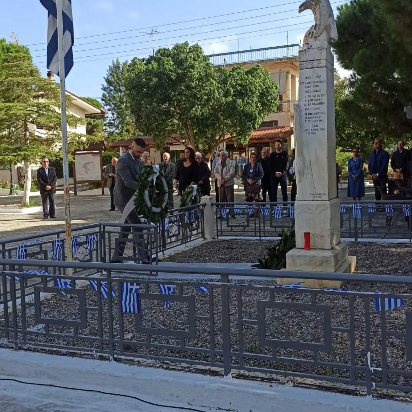 Στη συνέχεια πραγματοποιήθηκε κατάθεση στεφάνων από τις αρχές του τόπου, τους εκπροσώπους φορέων, επιστημονικών και αναπτυξιακών συλλόγων της περιοχής, καθώς και από τα στελέχη των ενόπλων δυνάμεων και των σωμάτων ασφαλείας, αποδίδοντας φόρο τιμής στους ήρωες του 40’.