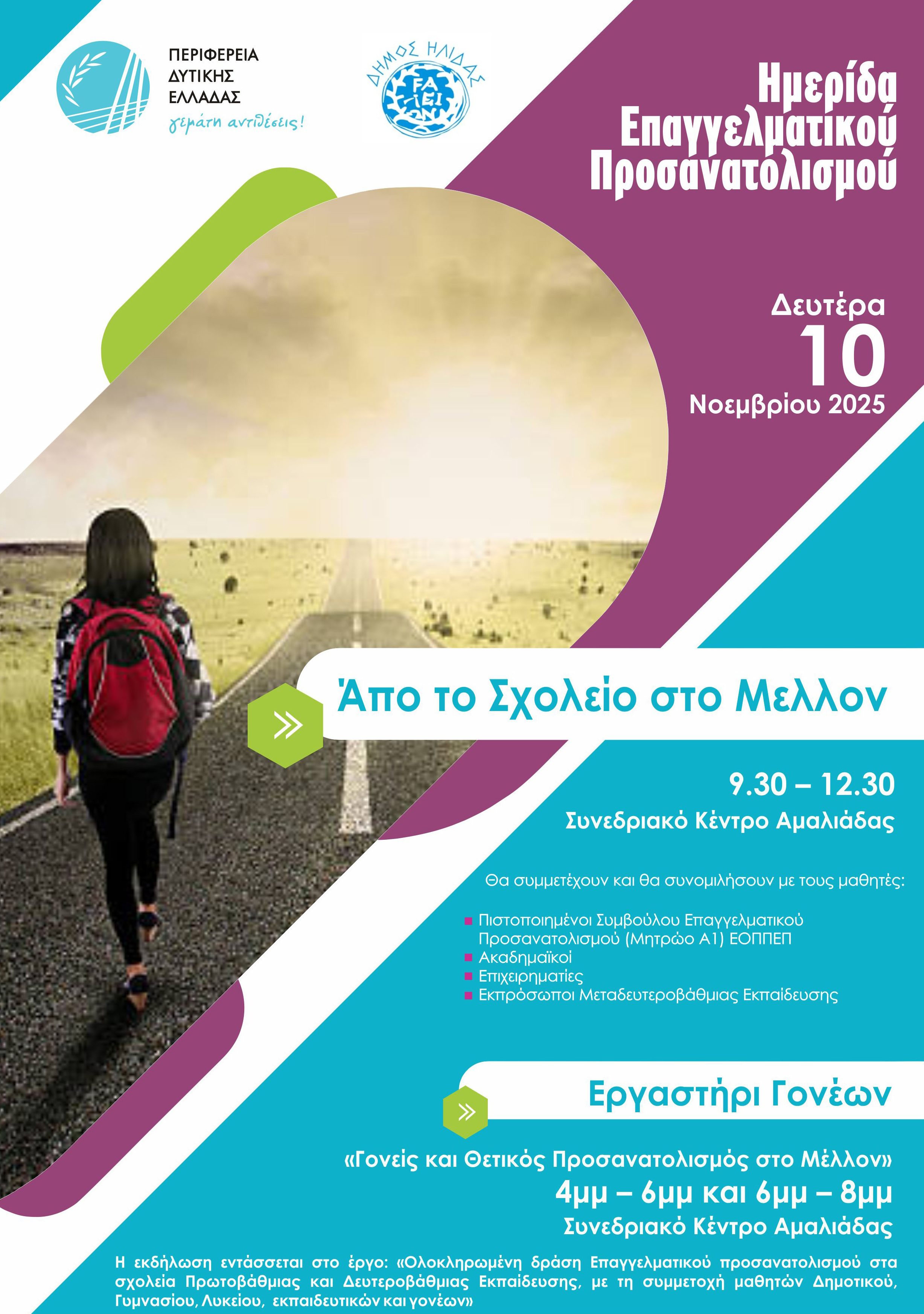 Μια σημαντική Ημερίδα Επαγγελματικού Προσανατολισμού, με τίτλο «Από το Σχολείο στο Μέλλον», θα πραγματοποιηθεί τη Δευτέρα 10 Νοεμβρίου 2025, από τις 9:30 έως τις 12:30, στο Συνεδριακό Κέντρο Αμαλιάδας, υπό τη διοργάνωση του Δήμου Ήλιδας και της Περιφέρειας Δυτικής Ελλάδας.
