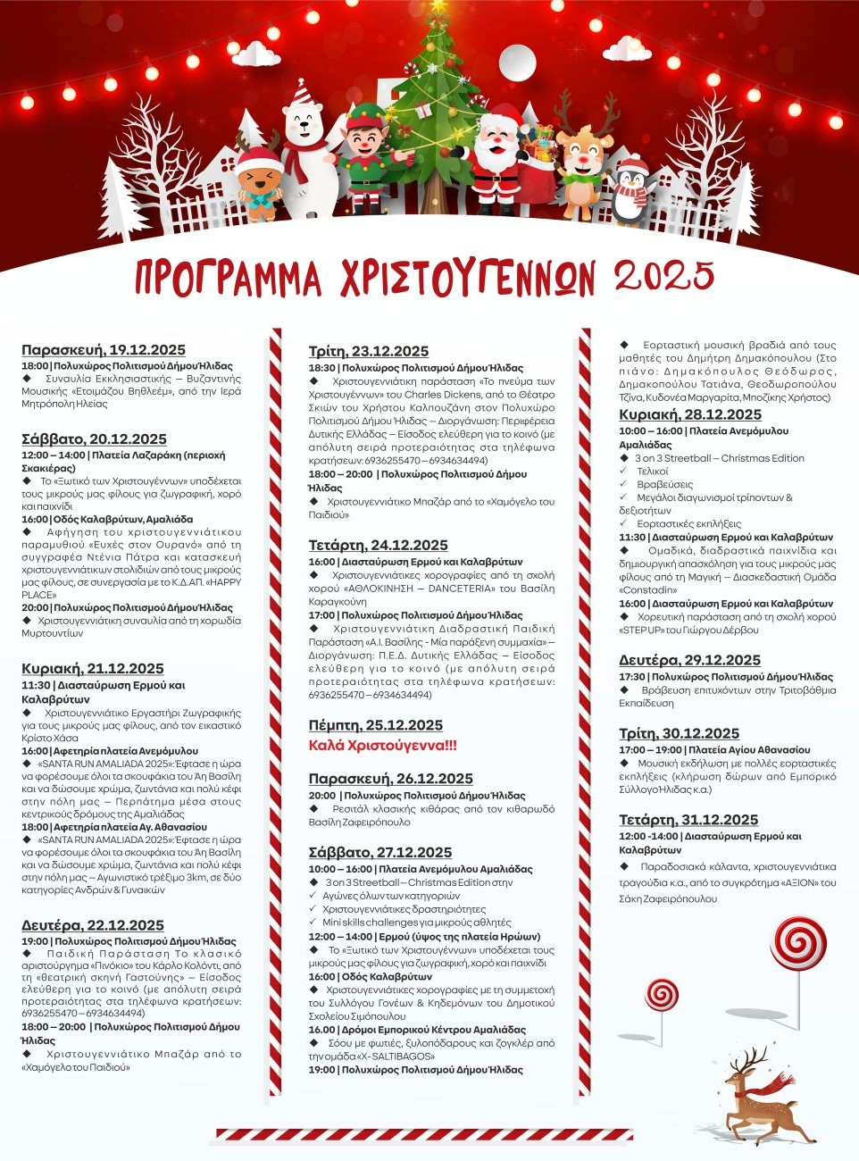 Με ένα πλούσιο και πολυδιάστατο εορταστικό πρόγραμμα, που απευθύνεται σε όλους τους πολίτες και δίνει πρωταγωνιστικό ρόλο στα παιδιά, ο Δήμος Ήλιδας υποδέχεται τα φετινά Χριστούγεννα, δημιουργώντας μια ζεστή γιορτινή ατμόσφαιρα σε ολόκληρη την Αμαλιάδα.