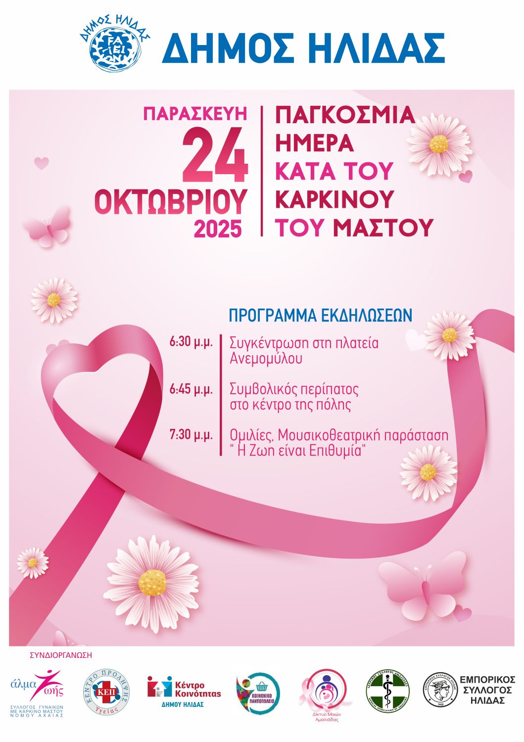 Οι εκδηλώσεις ξεκίνησαν με την καθιερωμένη πλέον «ροζ παρέλαση» στους κεντρικούς δρόμους της Αμαλιάδας. Η πορεία, που ξεκίνησε από την πλατεία Ανεμομύλου και κατέληξε στον Πολυχώρο Πολιτισμού του Δήμου Ήλιδας, γέμισε την πόλη με χρώμα, ενέργεια και συγκίνηση.