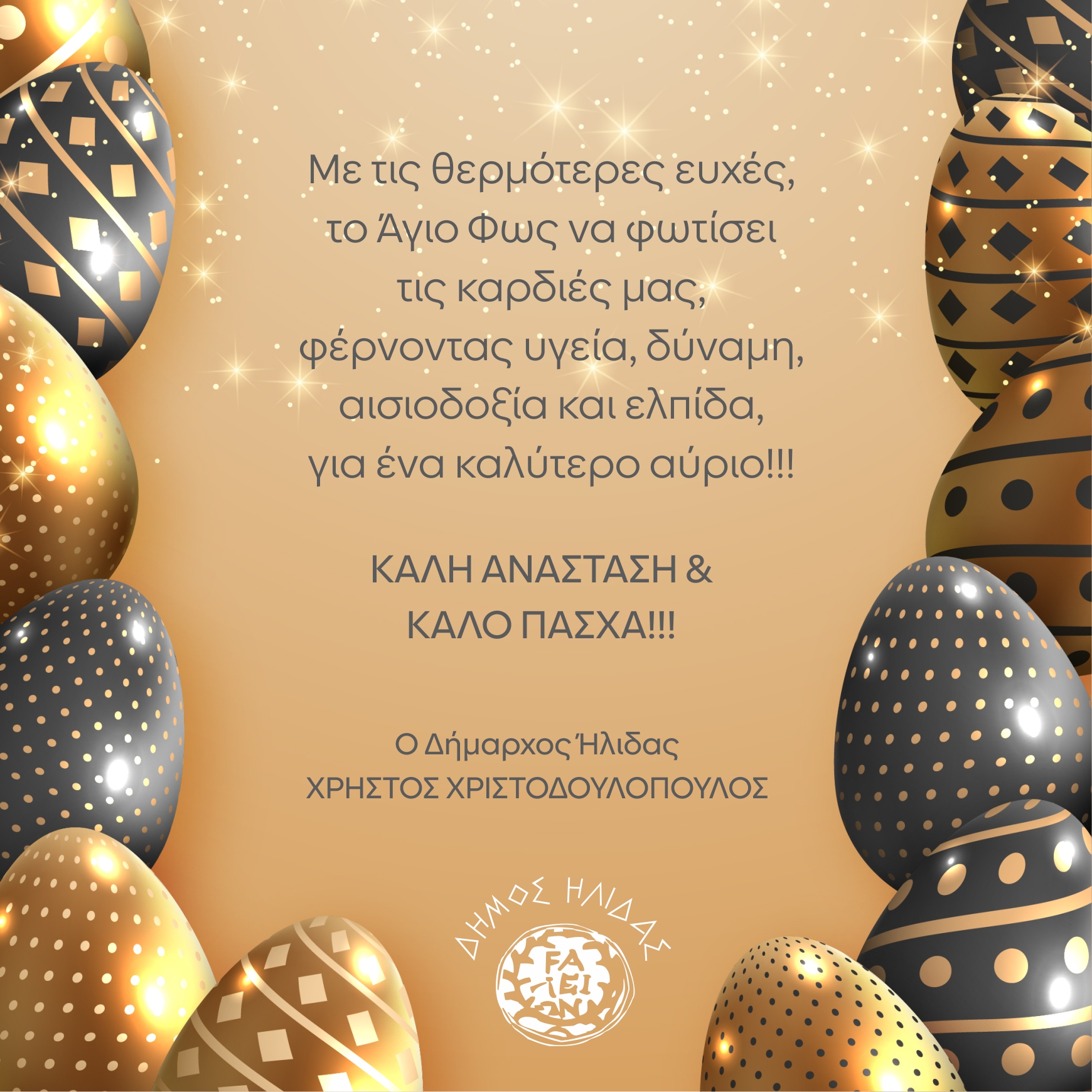 Εύχομαι ολόψυχα σε κάθε σπιτικό του Δήμου Ήλιδας, το φετινό Πάσχα να φέρει υγεία, γαλήνη και αληθινή ελπίδα.