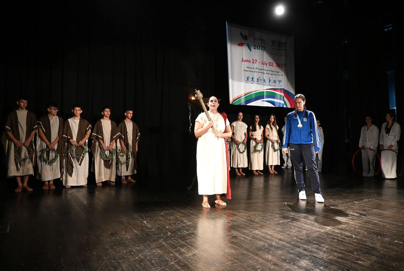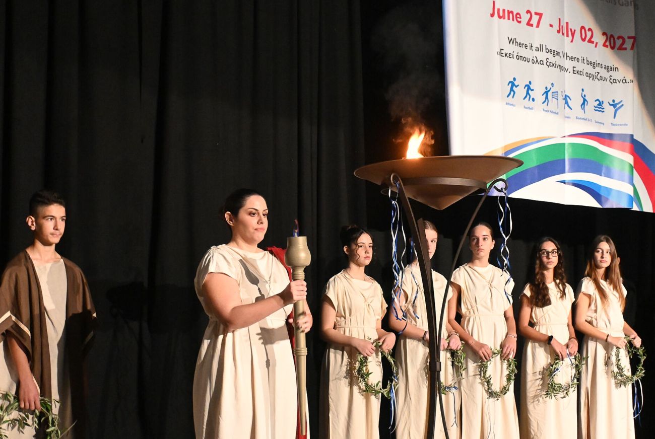 Μετά την ολοκλήρωση του δρώμενου, στη σκηνή βρέθηκε ο βωμός των αγώνων και η πρωθιέρια Αργυρώ Αντωνοπούλου παρέδωσε τη δάδα με την φλόγα του 2027 στη νεαρή αθλήτρια Δήμητρα Μηλιτσοπούλου, η οποία κατέκτησε το πρώτο μετάλλιο για τον Δήμο Ήλιδας στους Παγκόσμιους Παιδικούς Αγώνες του Ταλίν, το περασμένο καλοκαίρι. Την αθλήτρια ξεπροβόδισαν από το χώρο μαθητές του 2ου Γυμνασίου ως Ελλανοδίκες και μαθήτριες του ίδιου σχολείου ως ιέρειες.