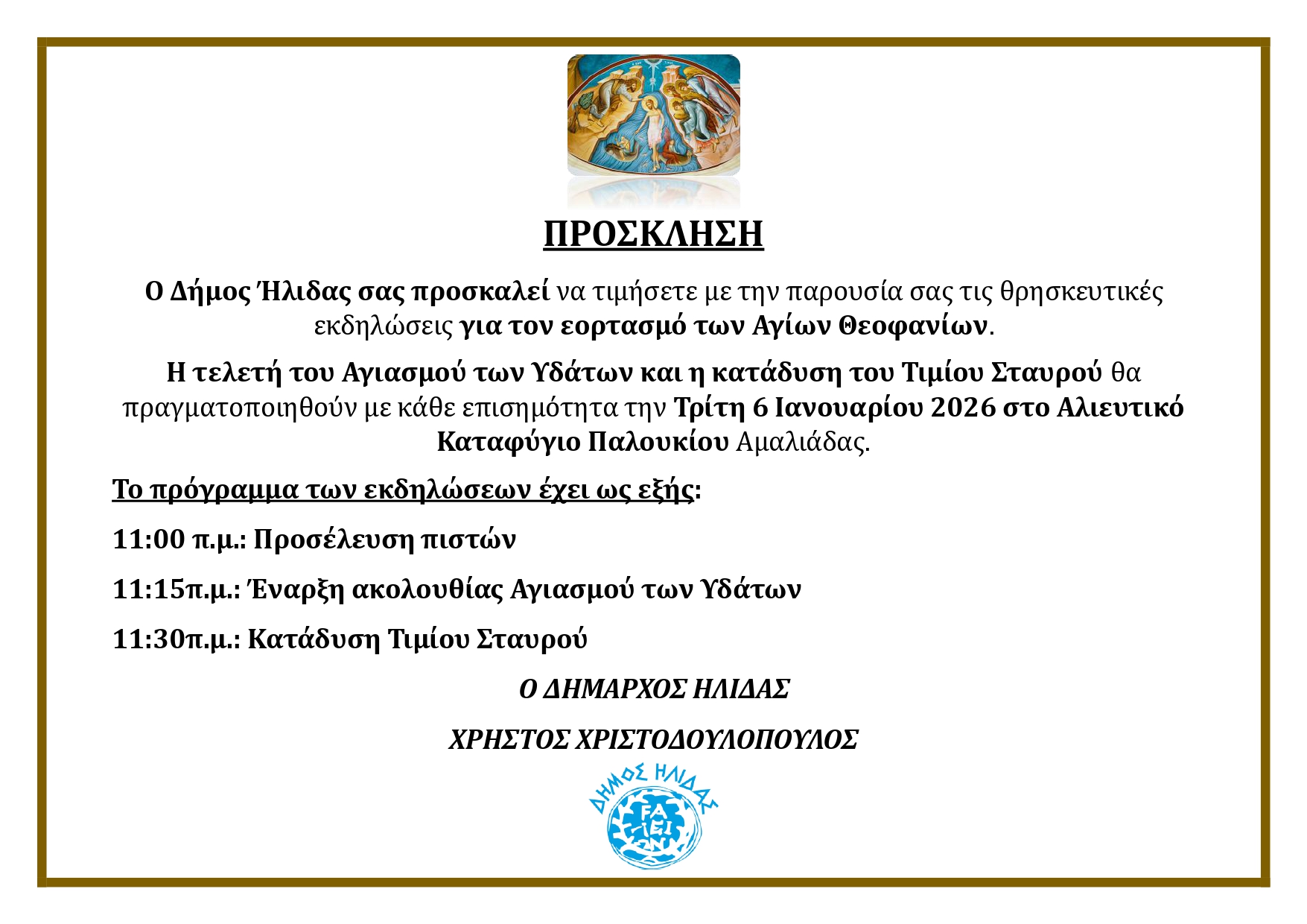 Ο Δήμαρχος Ήλιδας κ. Χρήστος Χριστοδουλόπουλος, απευθύνει ανοιχτή πρόσκληση προς όλους τους δημότες και τους επισκέπτες της περιοχής, Όπως τονίζει: «Σε μια ημέρα ιδιαίτερου συμβολισμού και πνευματικής ανάτασης, καλούμαστε όλοι μαζί στο λιμάνι μας στο Παλούκι, για να λάβουμε την ευλογία του Αγιασμού των Υδάτων, ευχόμενοι μια χρονιά γεμάτη φως, υγεία και ελπίδα για τον τόπο μας.»