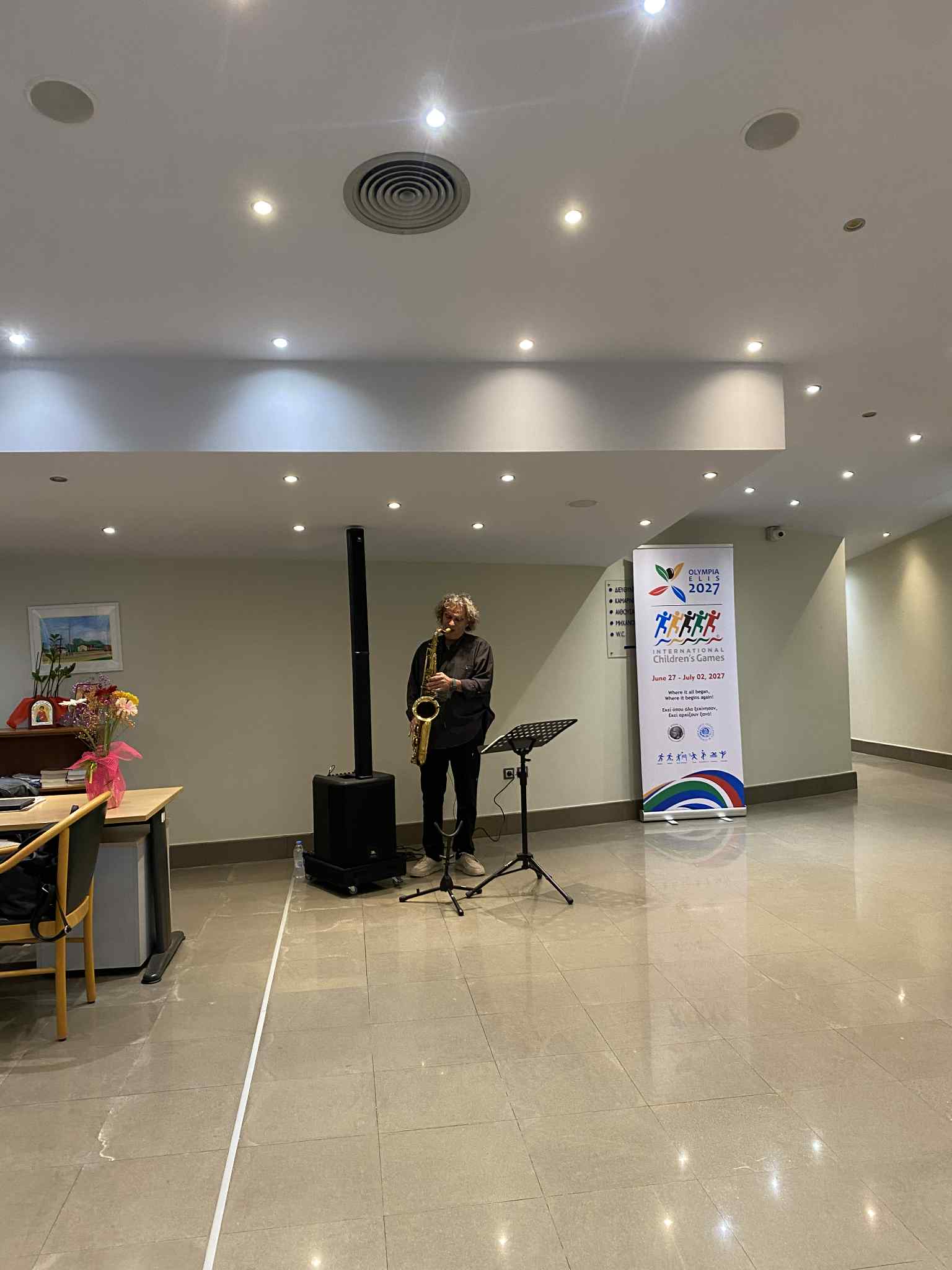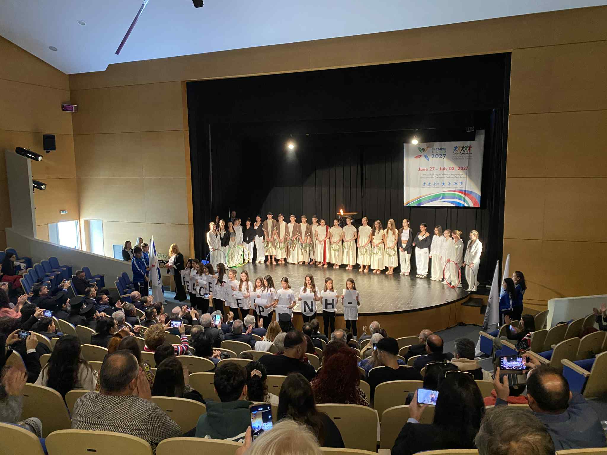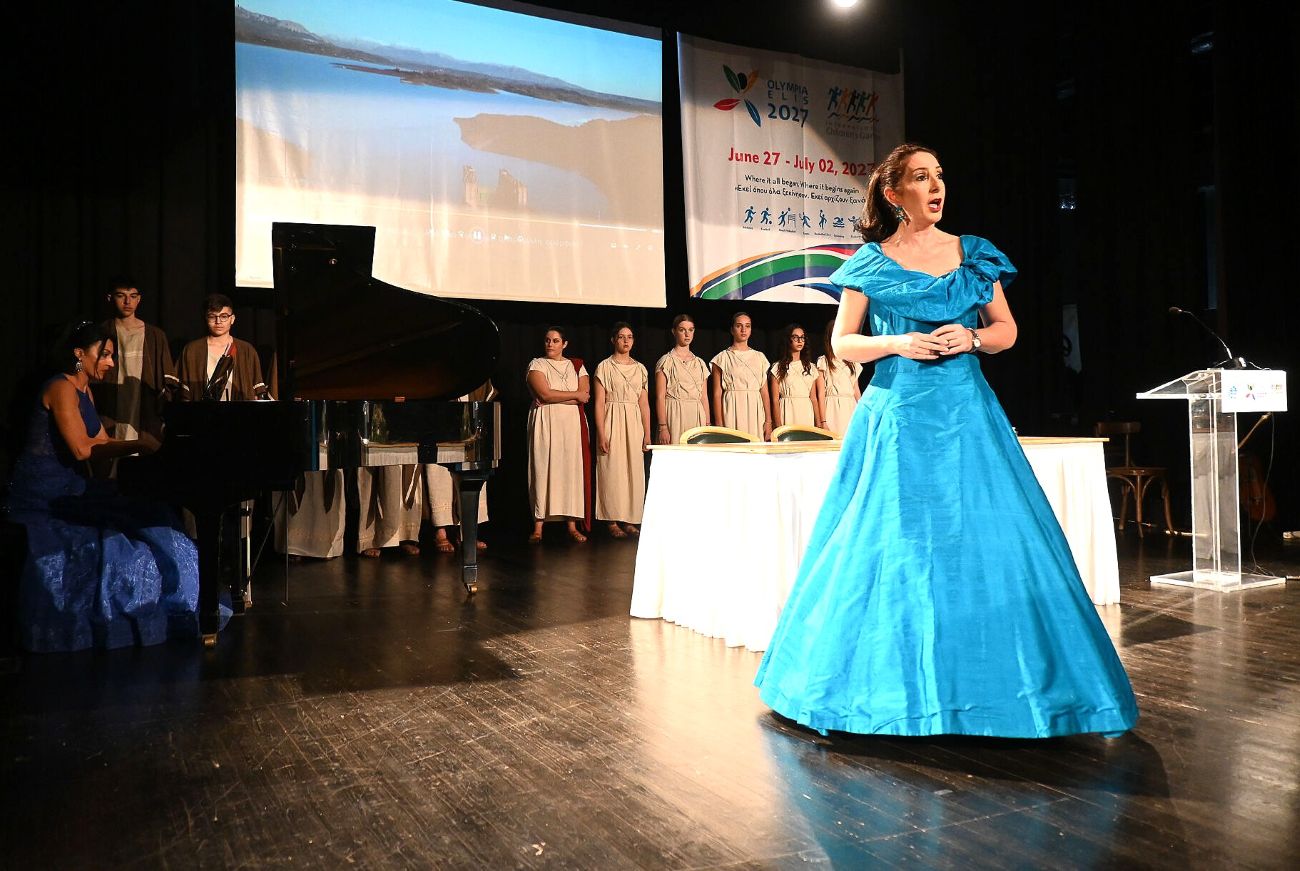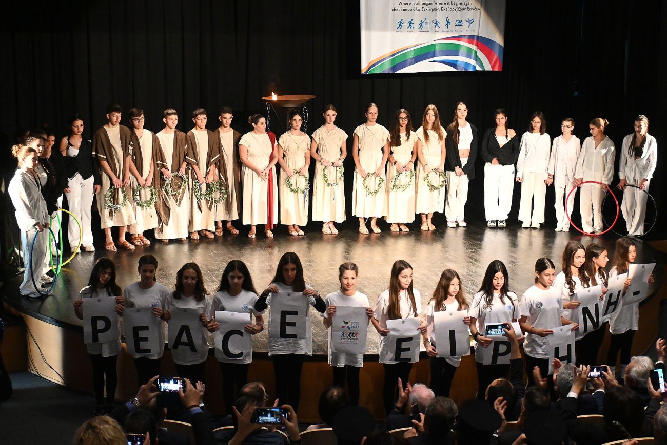Μια τελετή αντάξια της ιστορίας της Ήλιδας και της Ολυμπίας, η οποία άνοιξε με την έπαρση του λάβαρου των Αγώνων και του λογοτύπου του 2027, αλλά και του «Ύμνου της Ειρήνης» του Γιάννη Ρίτσου, από τη σοπράνο Λένα Σουρμελή και την πιανίστρια Elena Fedko, υπενθυμίζοντας τη βαθιά σχέση της περιοχής με τις αξίες της «Εκεχειρίας» και της «Ειρήνης».