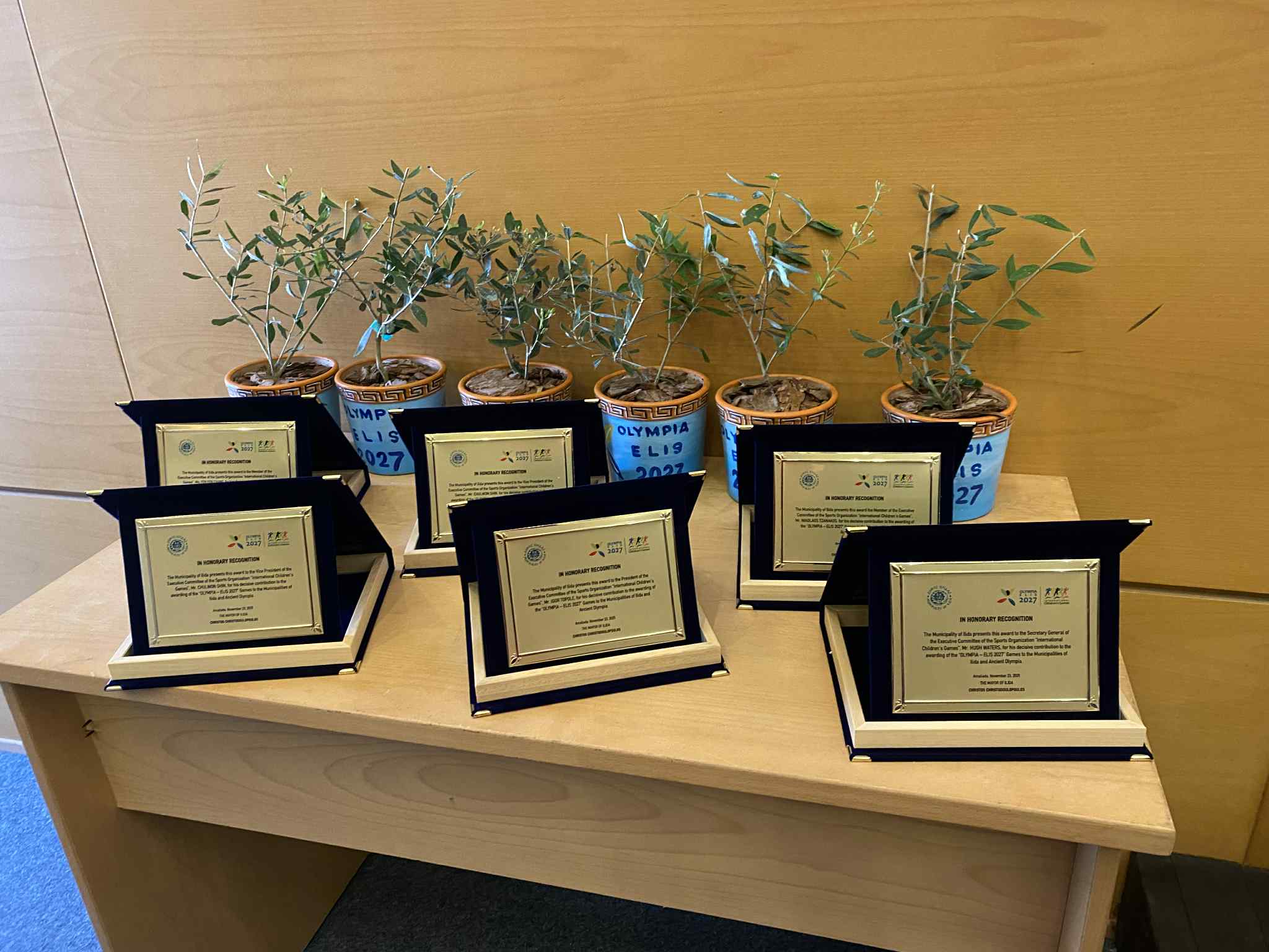Αμέσως μετά οι δύο πλευρές αντήλλαξαν συμβολικά δώρα, με τον δήμαρχο Ήλιδας εκτός της τιμητικής πλακέτας, να προσφέρει στα πέντε μέλη της ΕΕ και στον πρόεδρο του Διεθνούς Αθλητικού Φορέα των ICG, ένα δέντρο ελιάς από την ιερή γη της Αρχαίας Ήλιδας.
