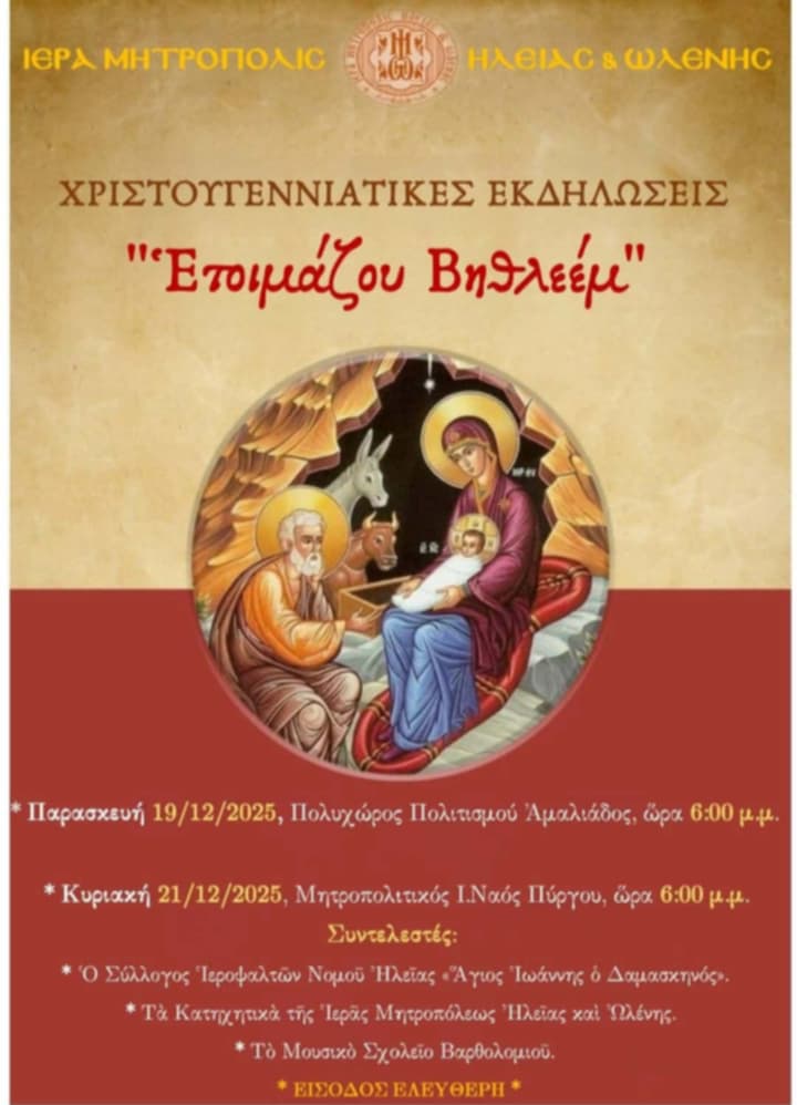 Η θρησκευτικού χαρακτήρα εκδήλωση, με τίτλο «Ετοιμάζου Βηθλεέμ», θα πραγματοποιηθεί την Παρασκευή 19 Δεκεμβρίου 2025 και ώρα 18:00, στον Πολυχώρο Πολιτισμού Αμαλιάδας, με ελεύθερη είσοδο για όλους.