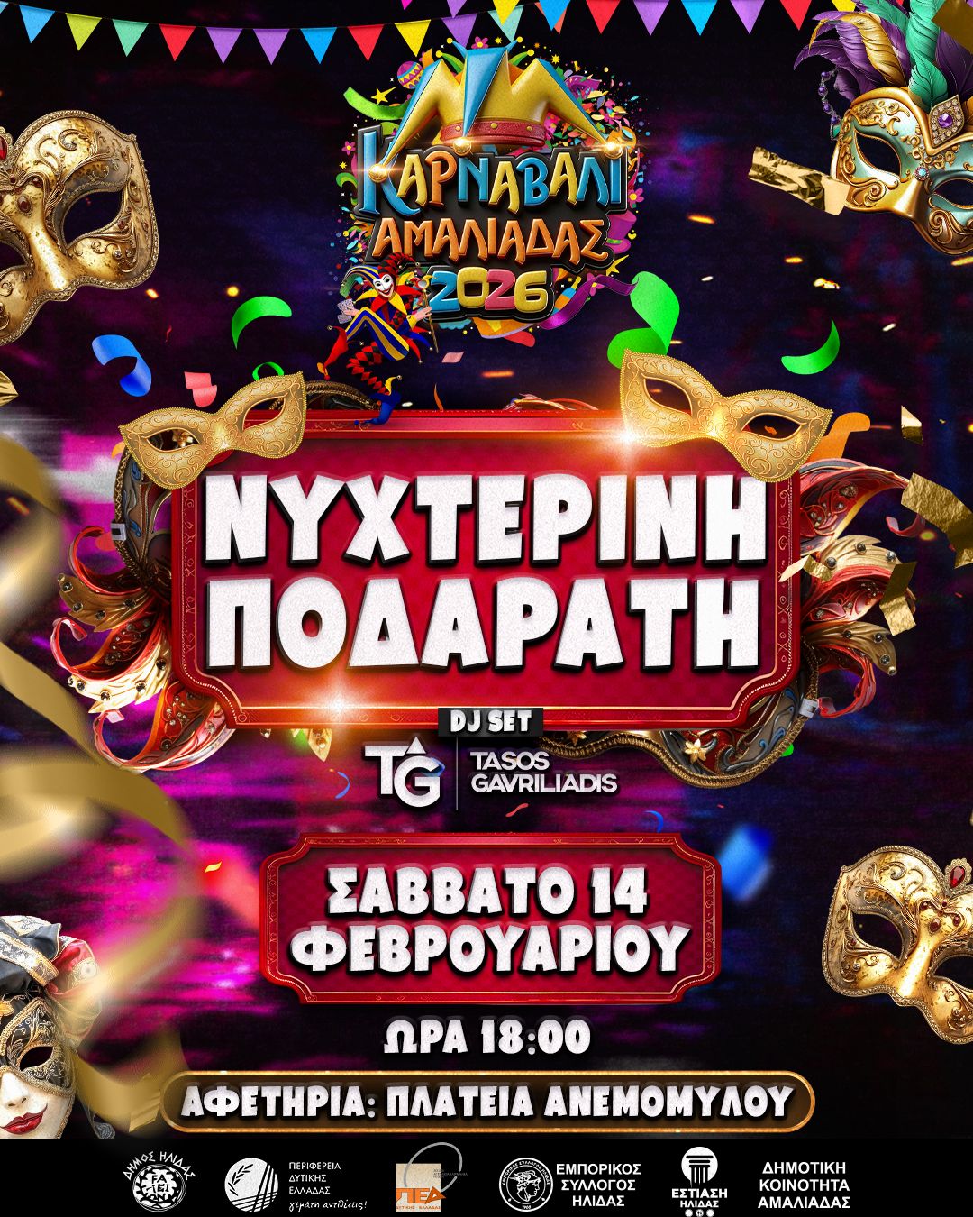 14 Φεβ 2026 18:00 Στις οδούς Αρχαίας Ήλιδας και Ερμού (Αφετηρία: Πλατεία Ανεμομύλου) Νυχτερινή Ποδαράτη Παρέλαση «ΚΑΡΝΑΒΑΛΙ ΑΜΑΛΙΑΔΑΣ 2026» 59 προβολές 18:00 ΝΥΧΤΕΡΙΝΗ ΠΟΔΑΡΑΤΗ ΠΑΡΕΛΑΣΗ ΑΜΑΛΙΑΔΑΣ – Στις οδούς Αρχαίας Ήλιδας και Ερμού (Αφετηρία: Πλατεία Ανεμομύλου)