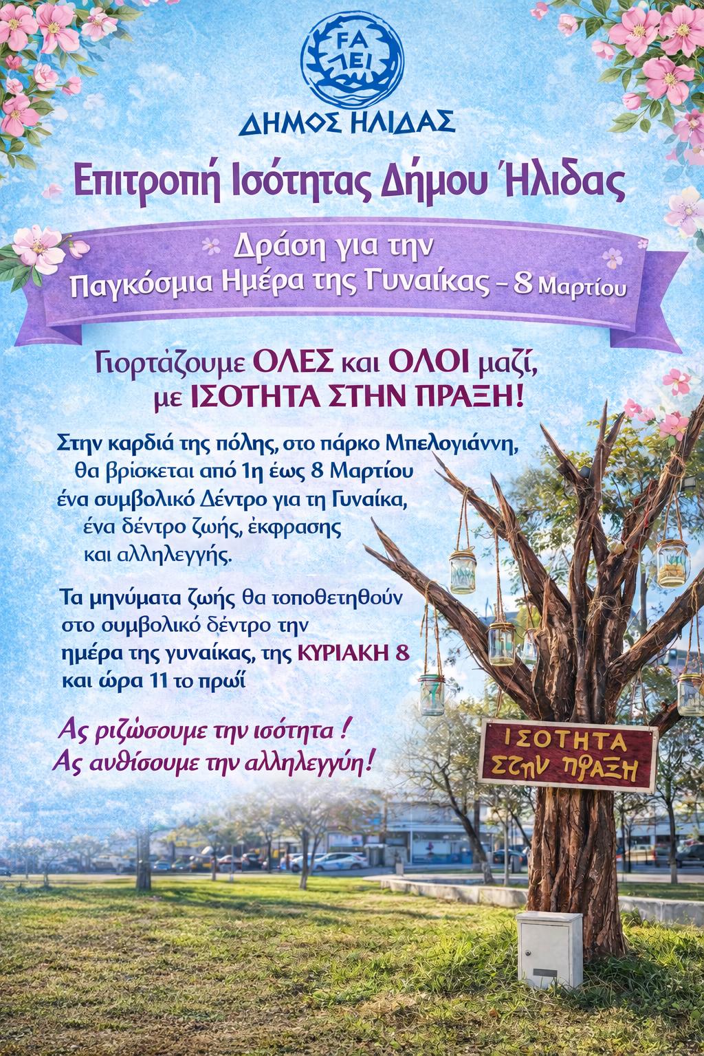 Με κεντρικό σύνθημα «Ισότητα στην Πράξη», η καρδιά της Αμαλιάδας μεταμορφώνεται σε έναν χώρο έκφρασης και αλληλεγγύης. Από την 1η έως και τις 8 Μαρτίου, ένα συμβολικό «Δέντρο για τη Γυναίκα», θα βρίσκεται τοποθετημένο σε κεντρικό σημείο, περιμένοντας να «ντυθεί» με τις δικές σας λέξεις.