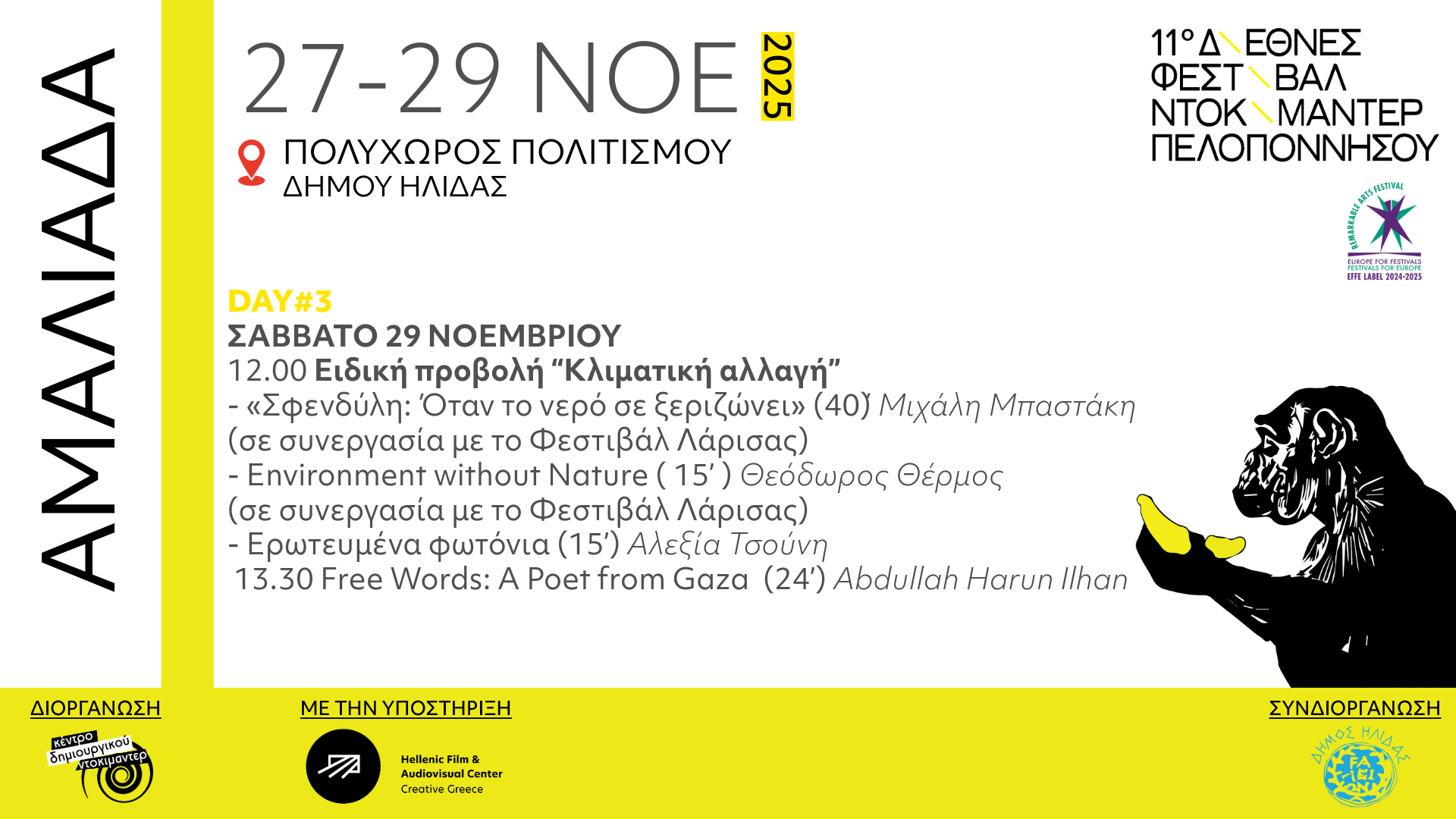 Στο πλαίσιο του φετινού προγράμματος, το κοινό της Αμαλιάδας θα έχει την ευκαιρία να απολαύσει μια προσεκτικά επιλεγμένη σειρά ντοκιμαντέρ από την Ελλάδα και το εξωτερικό, τα οποία θα προβληθούν την Πέμπτη 27 και την Παρασκευή 28 Νοεμβρίου 2025 από τις 17:00, καθώς και το Σάββατο 29 Νοεμβρίου από τις 12:00, στο αμφιθέατρο του Πολυχώρου Πολιτισμού Δήμου Ήλιδας.
