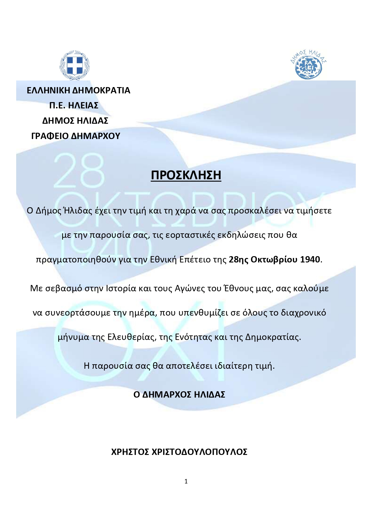 Με σεβασμό και εθνική υπερηφάνεια, ο Δήμος Ήλιδας τιμά την επέτειο της 28ης Οκτωβρίου 1940, ημέρα σύμβολο της ενότητας, της γενναιότητας και της ανδρείας του ελληνικού λαού.