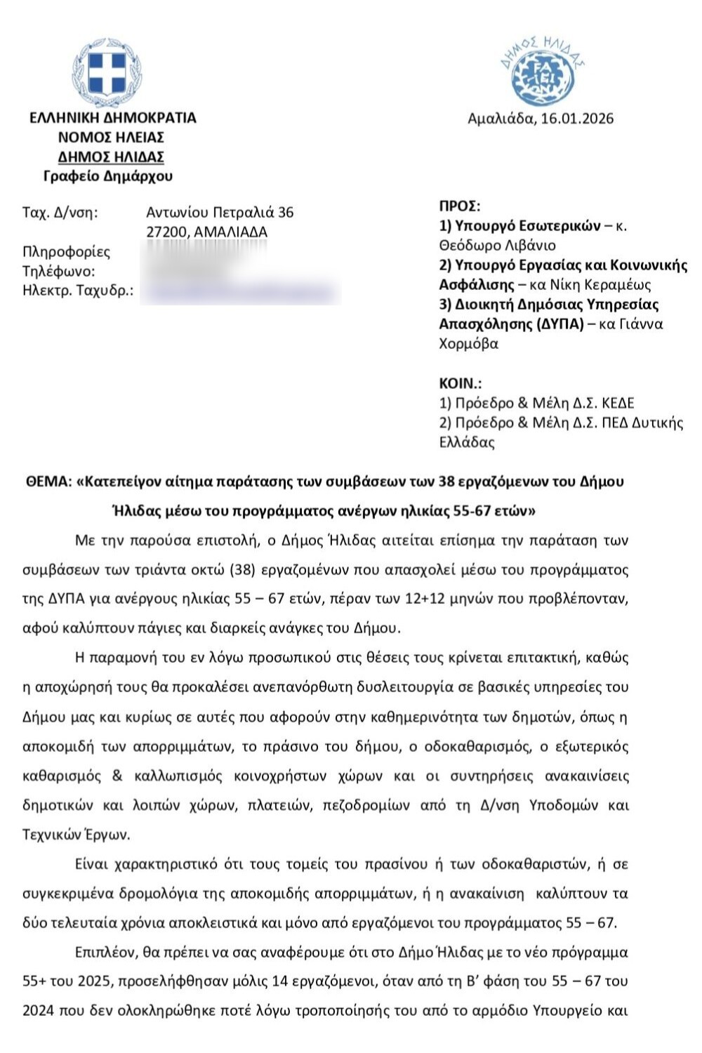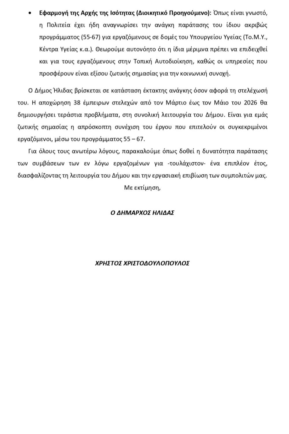 Με επίσημο έγγραφό του προς τον Υπουργό Εσωτερικών κ. Θεόδωρο Λιβάνιο, την Υπουργό Εργασίας κα Νίκη Κεραμέως και τη Διοικήτρια της ΔΥΠΑ κα Γιάννα Χορμόβα, ο κύριος Χριστοδουλόπουλος αιτείται την κατεπείγουσα παράταση των συμβάσεων των 38 εργαζομένων του Δήμου Ήλιδας μέσω του προγράμματος 55-67, οι οποίες λήγουν το διάστημα Μαρτίου – Μαΐου 2026.