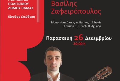 Ο Δήμος Ήλιδας προσκαλεί το φιλότεχνο κοινό σε μια ξεχωριστή μουσική βραδιά με αφορμή το φετινό εορταστικό πρόγραμμα, την Παρασκευή 26 Δεκεμβρίου και ώρα 20:00, στον Πολυχώρο Πολιτισμού, με πρωταγωνιστή τον διακεκριμένο σολίστ κλασικής κιθάρας, Βασίλη Ζαφειρόπουλο.