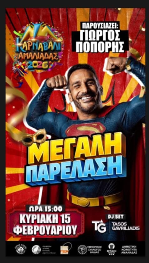15 Φεβ 2026 15:00 Στις οδούς Αρχαίας Ήλιδας και Ερμού (Αφετηρία: Πλατεία Ανεμομύλου) Μεγάλη Καρναβαλική Παρέλαση «ΚΑΡΝΑΒΑΛΙ ΑΜΑΛΙΑΔΑΣ 2026» 9 προβολές 15:00 ΜΕΓΑΛΗ ΚΑΡΝΑΒΑΛΙΚΗ ΠΑΡΕΛΑΣΗ – Στις οδούς Αρχαίας Ήλιδας και Ερμού (Αφετηρία: Πλατεία Ανεμομύλου)18:00 Κάψιμο Βασιλιά Καρνάβαλου – Πλατεία Αγ. Αθανασίου (Συνοδεία DJ’s set – Carnival Music by Tasos Gavriliadis και σόου πυροτεχνημάτων)